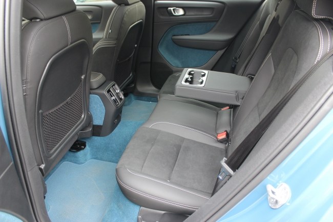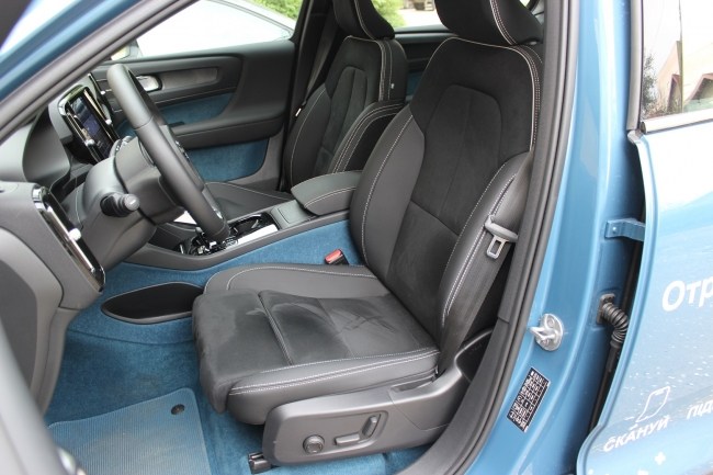 До того ж, покриття підлоги виготовлене на 100% із перероблених пластикових пляшок - ще один внесок у охорону довкілля. З цієї ж причини суто шкіряного оздоблення для салону С40 не пропонується. І хоча зовні обробку інтер’єру тестової Volvo C40 можна прийняти за шкіру та алькантару, насправді це комбінація замшевого текстилю та спеціального матеріалу Microtech.