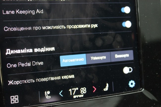 Найцікавіша функція, яка сподобалась вашому покірному слузі протягом тест-драйву - це автоматичний режим управління роботи «однією педаллю», котрий бере до уваги інтенсивність навколишнього трафіку. Якщо, скажімо, ви зменшите тиск на педаль акселератора, прямуючи порожнім шосе, С40 Recharge продовжить рухатись накатом, майже не сповільнюючись. Якщо ж датчики зафіксують наявність транспортного засобу чи іншої перешкоди попереду, реакція на «скидання газу» буде доволі інтенсивною - аж до повної зупинки на безпечній відстані. Втім, це не «активний круїз», самостійно рухатись разом із трафіком попереду Volvo потім не стане, лише нагадає про те, що машина попереду вже рушила.